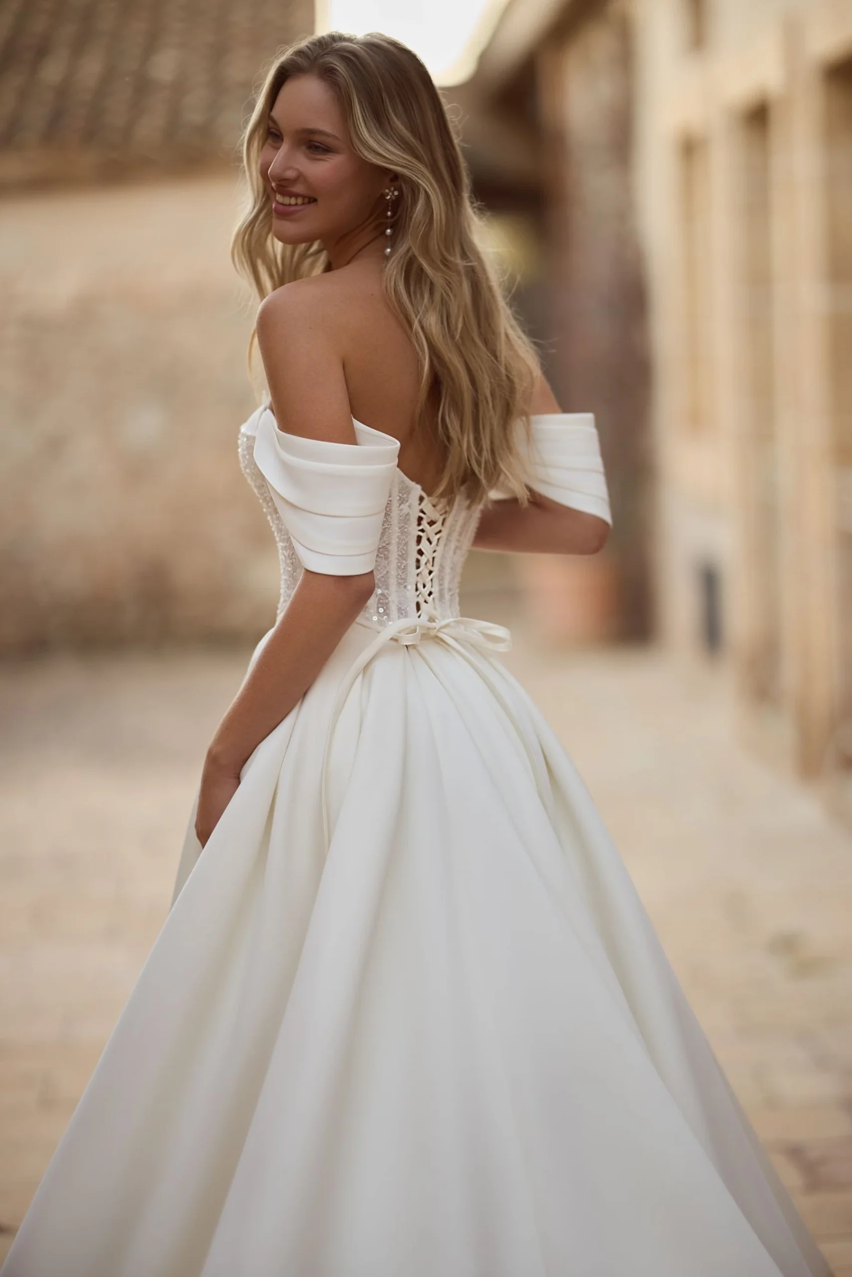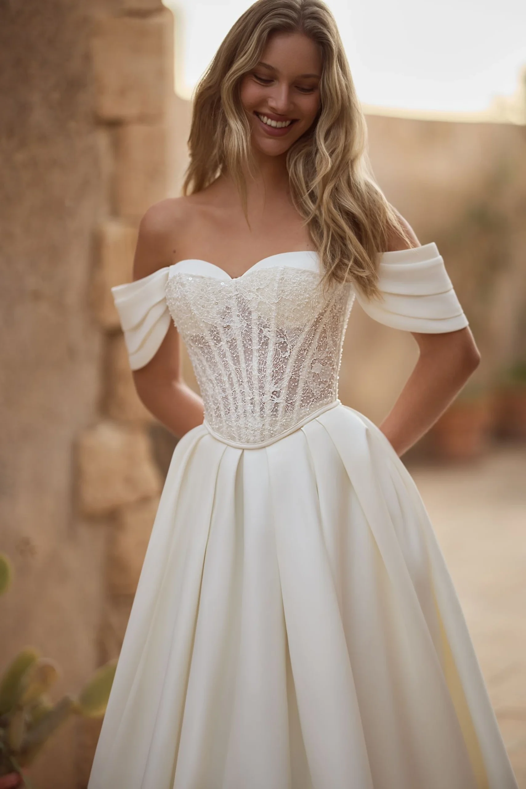 Šī nepārspējamā kāzu kleita, kas sastāv no korsetes un svārkiem (princese griezums) ivora krāsā, palīdzēs radīt neaizmirstamu romantisku tēlu līgavai, kas ir pārpildīta ar mīlestības laimes sajūtu. Pusstieptā korsete ir maigi izšūta ar ziedu mežģīnēm un romantisku sirds formas dekoltē, kas vilinoši izceļ krūtis un atklāj jutīgās plecus. Kleitas augšdaļa ir nedaudz iegriezta zem lāpstiņu līmeņa ar mežģīņu aizdari. Svārki ir apjomīgi ar greznu vilcienu, izgatavoti no satīna auduma. Augšējā daļa ir salocīta mazos salikumos. Svārki ir aizdarināti muguras centrā ar slēpto rāvējslēdzēju. Kleita ir ar noņemamām siksnām, kas dekorētas ar satīna auduma salikumiem. Šo kleitu var iegādāties arī ar āķa un acs aizdari.