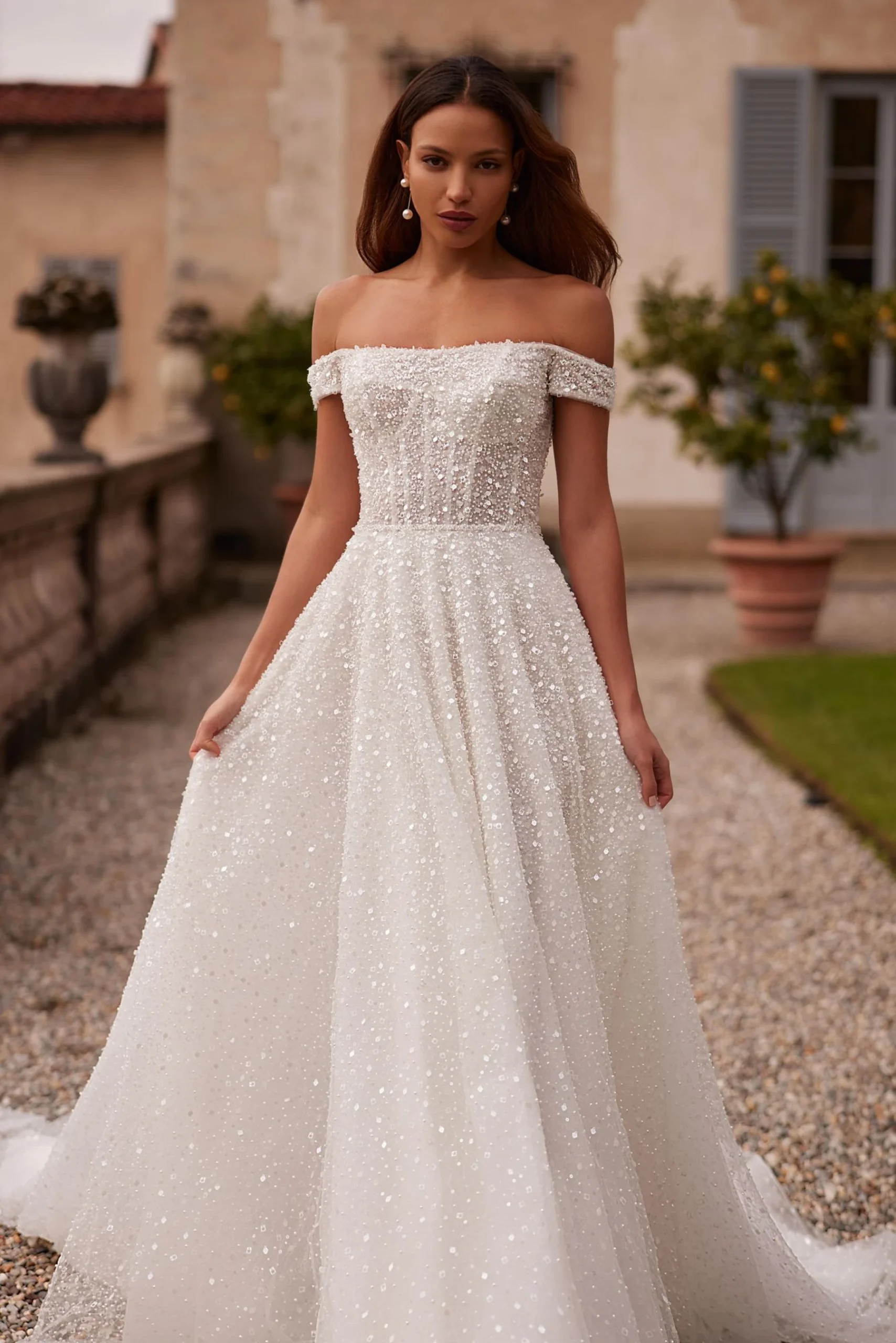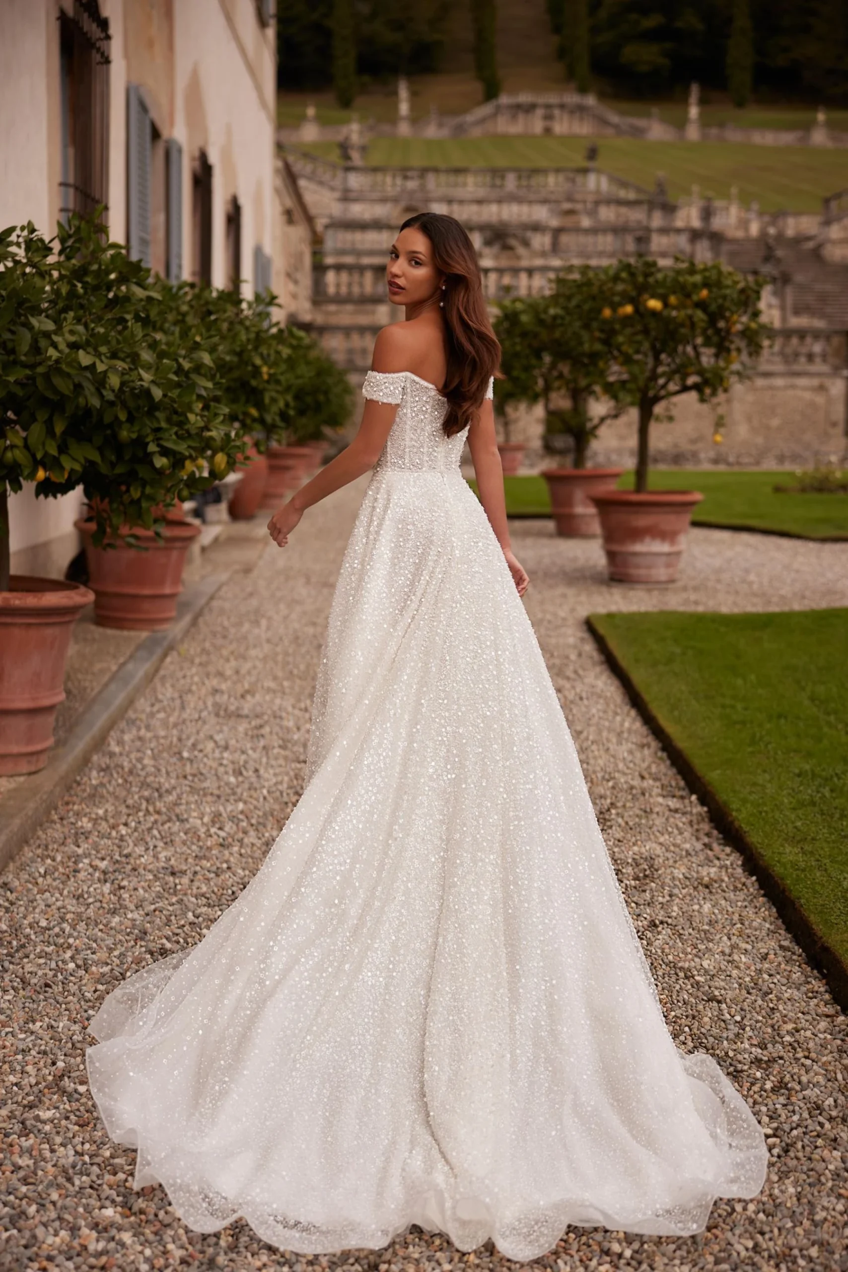 Greznā kāzu pasākumā līgava mirdzēs no laimes un izstaro maigus starus no sava neticami skaistā A-veida tērpa, kas izgatavots no izšūtas mežģīnes ivorijas krāsā. Puscaurspīdīgais korsets ir ar laivas kakla izgriezumu, kas gludi pāriet īsajās piedurknēs no izšūtas mežģīnes, kas vilinoši atsedz smalkos plecus un atslēgas kaulus. Aizmugurē ir viegli V-veida kakla izgriezums, tieši zem lāpstiņu līnijas. Korsets ir aizdarināts ar slēptu rāvējslēdzēju. Kleitas svārki ir uzpūsti ar apjomīgu vilcienu, kas izgatavots no izšūtas mežģīnes un spīdumiem. Kleita aizdarināta ar slēptu rāvējslēdzēju. Viesi ilgi atcerēsies šo neticami laimīgo pāri, īpaši līgavu, kas viegli griežas apkārt mirdzošajā kāzu kleitā.